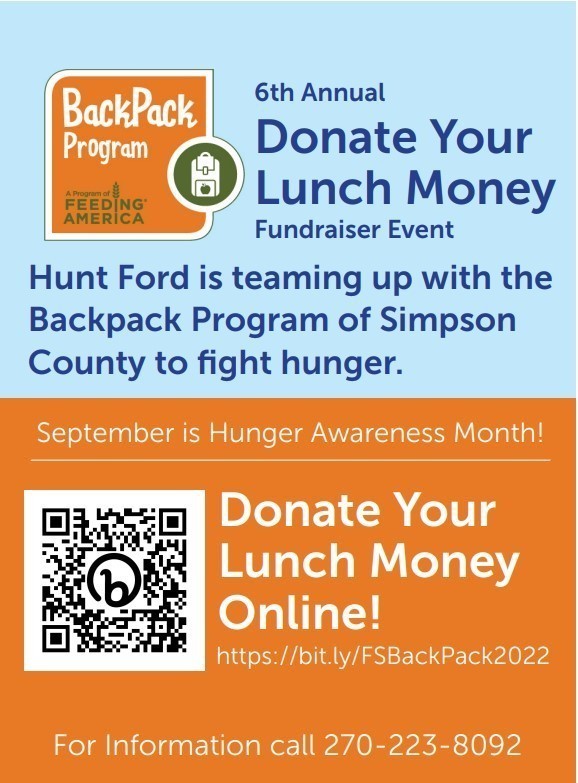 Simpson County Schools in partnership with Hunt Ford are fighting food insecurity. One in five children go to bed hungry every night in the Feeding America Kentucky Heartland service area. Help us today to provide 200 bags of food a week for our Simpson Co. students.